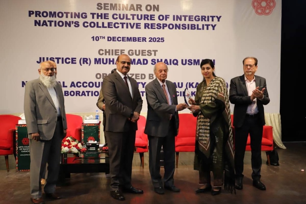 The Applied Economics Research Centre (AERC), University of Karachi, is pleased to share that Prof. Dr. Nooreen Mujahid, Director AERC, participated as a speaker at the prestigious seminar titled “Promoting the Culture of Integrity – Nation’s Collective Responsibility,” organized by the National Accountability Bureau (Karachi) on 10th December 2025 at the Arts Council of Pakistan, Karachi.